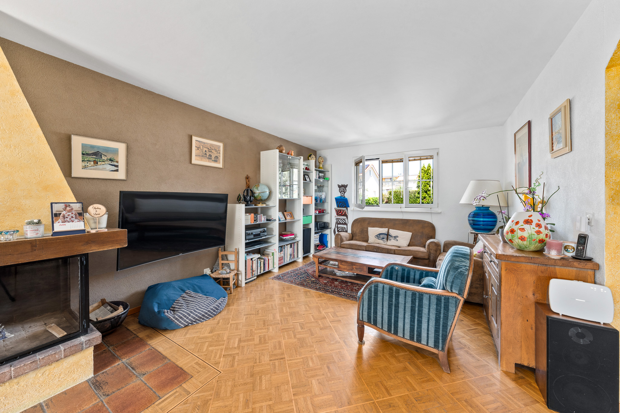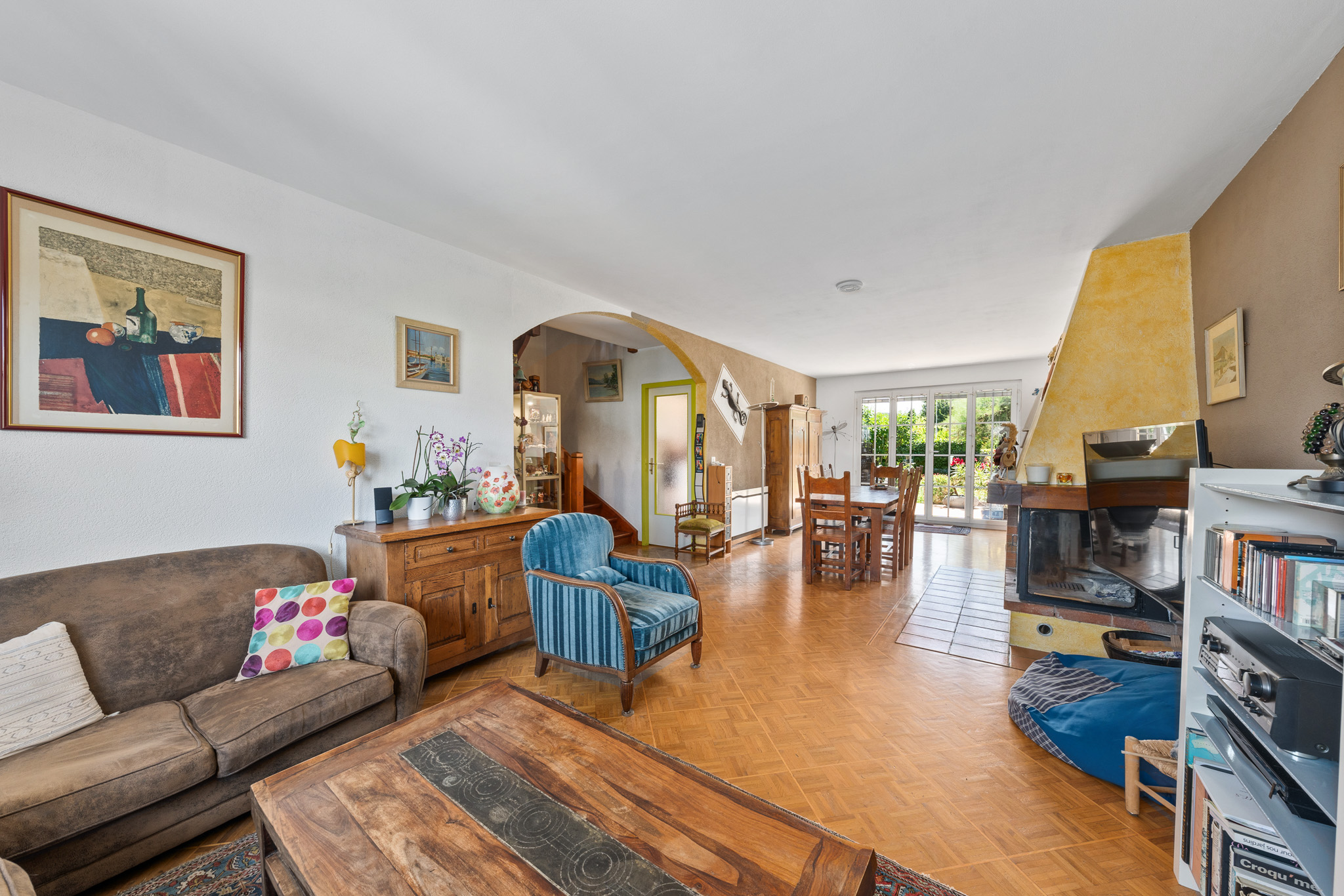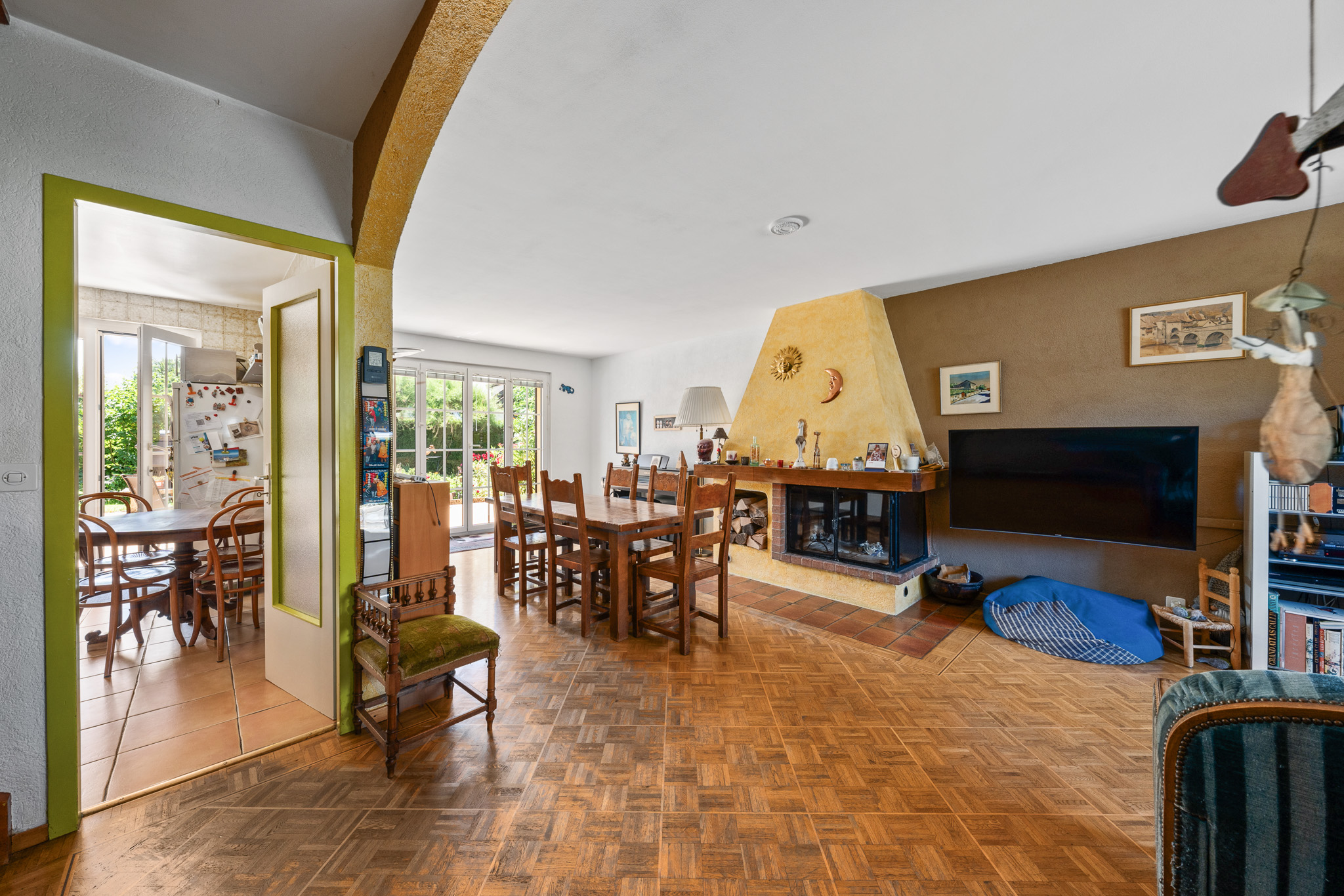 - Une salle à manger/séjour avec cheminée donnant sur la terrasse