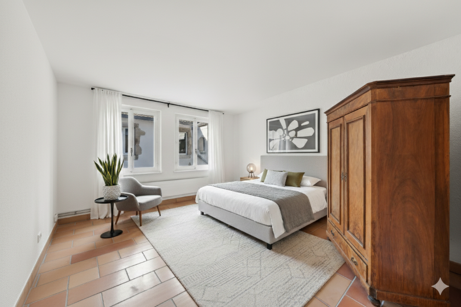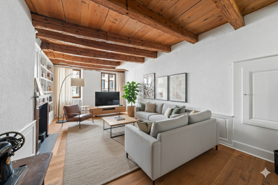 Ses appartements, respectivement de 4 pièces, offrent un cachet unique, alliant confort et modernité. La boutique au sous-sol est actuellement louée pour un salon de coiffure.