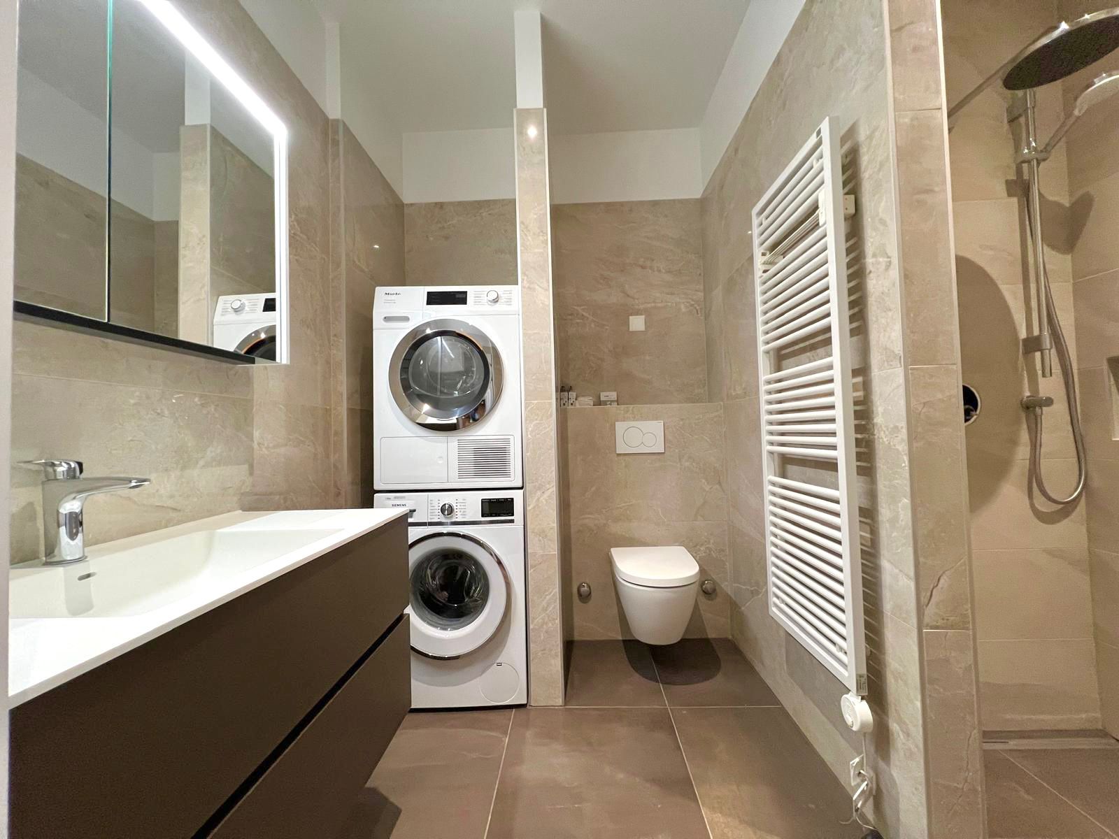 - Une salle de bain avec colonne de lavage, WC et douche à l'italienne