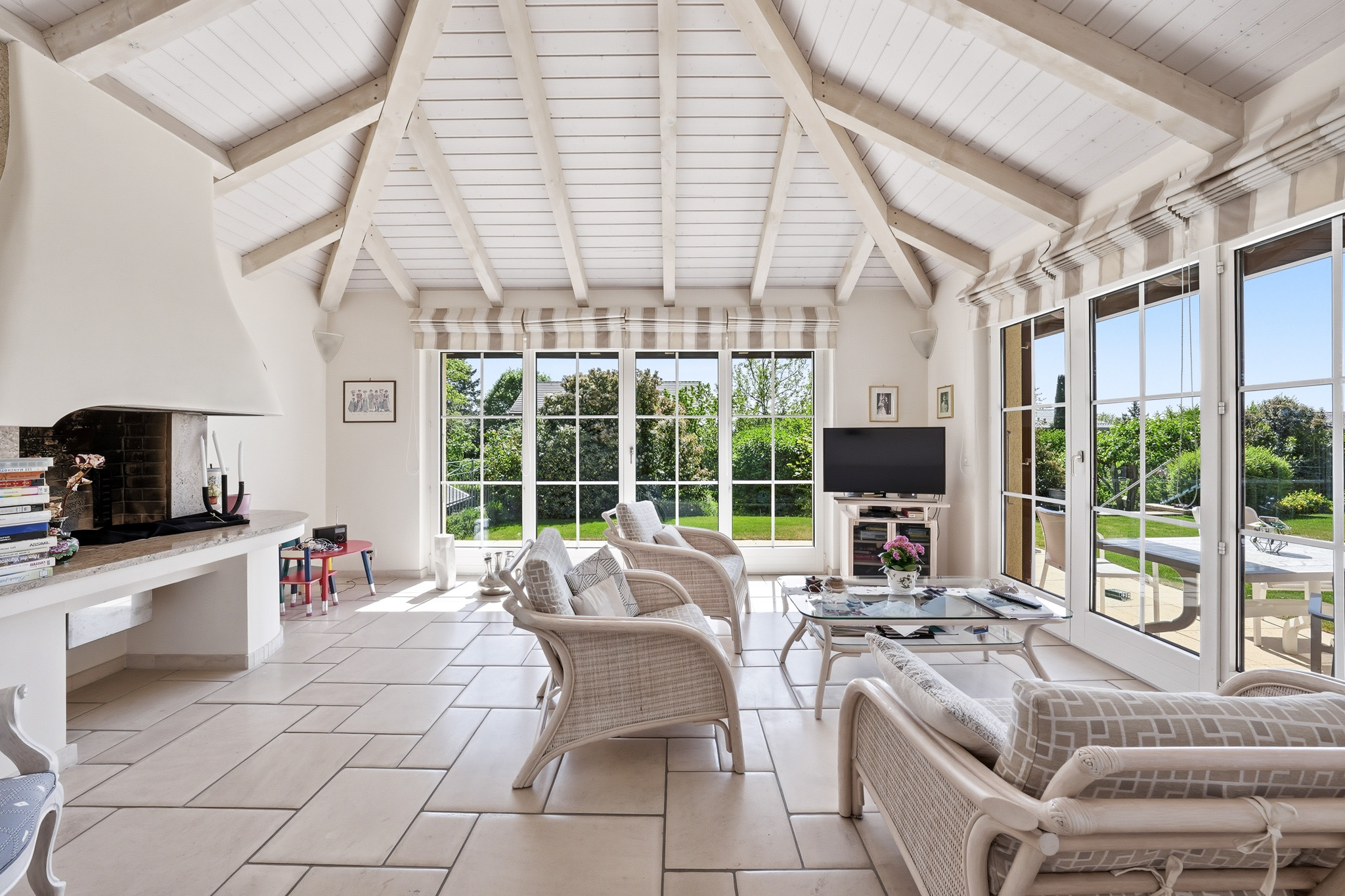 - Le séjour, agrémenté d’une cheminée, s’ouvre sur la terrasse et le jardin, offrant une belle continuité entre intérieur et extérieur.